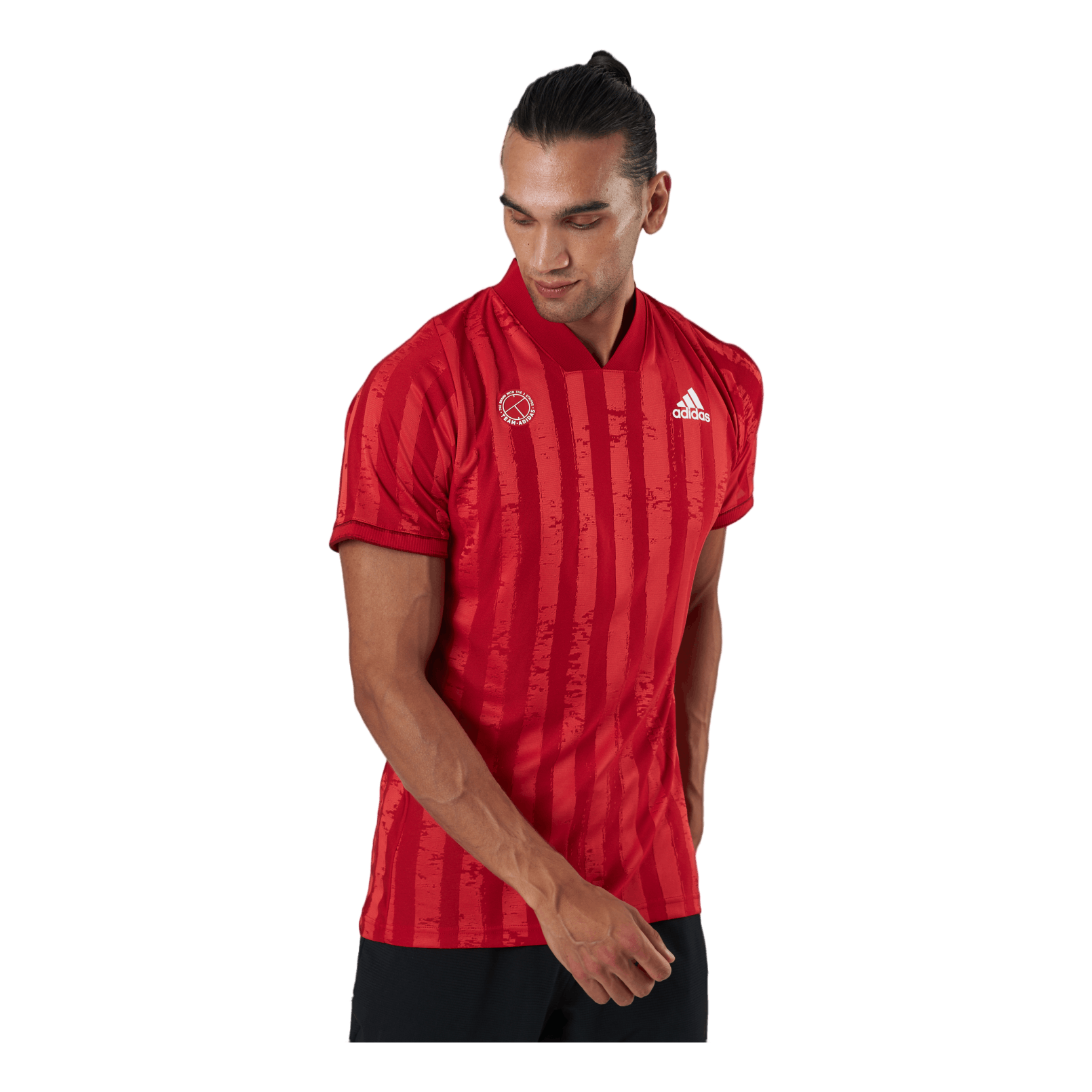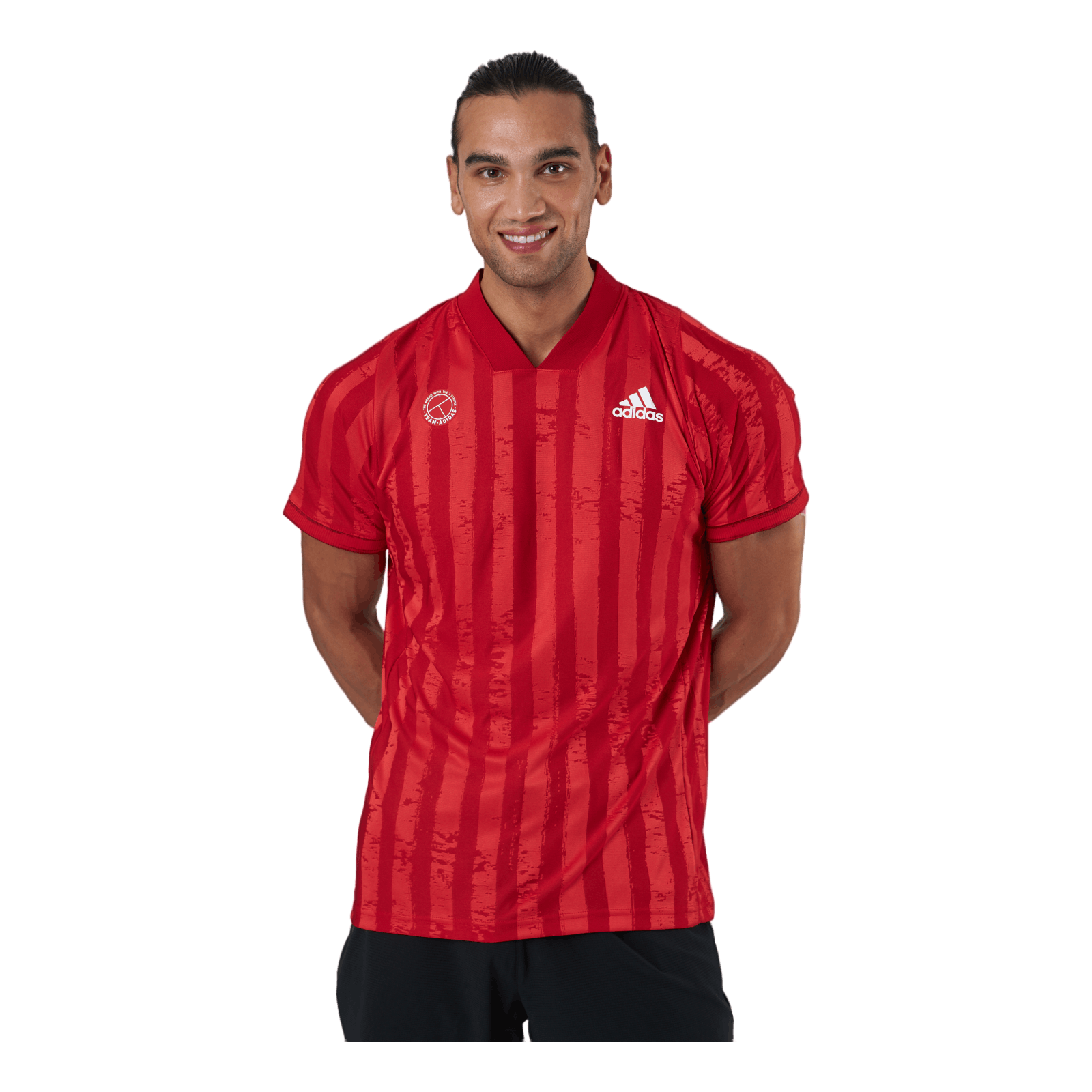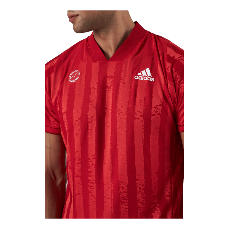 Ohut tennispaita juhlistaa urheilullista kesää. Urheilun kotiintulon juhla. Tämä adidas-t-paita on Lontoon kahden suuren urheilutapahtuman isännöintipaikka. Sen silmiinpistävä raidallinen muotoilu on saanut inspiraationsa juuri niitetyistä nurmikentistä ja jalkapallokentistä. Myös erottuva kaulus ja merkki on lainattu kauniista pelistä. Sen kosteutta imevä kangas on valmistettu kierrätetyistä materiaaleista, jotta voidaan luoda vähemmän ympäristöä kuormittavia tuotteita.