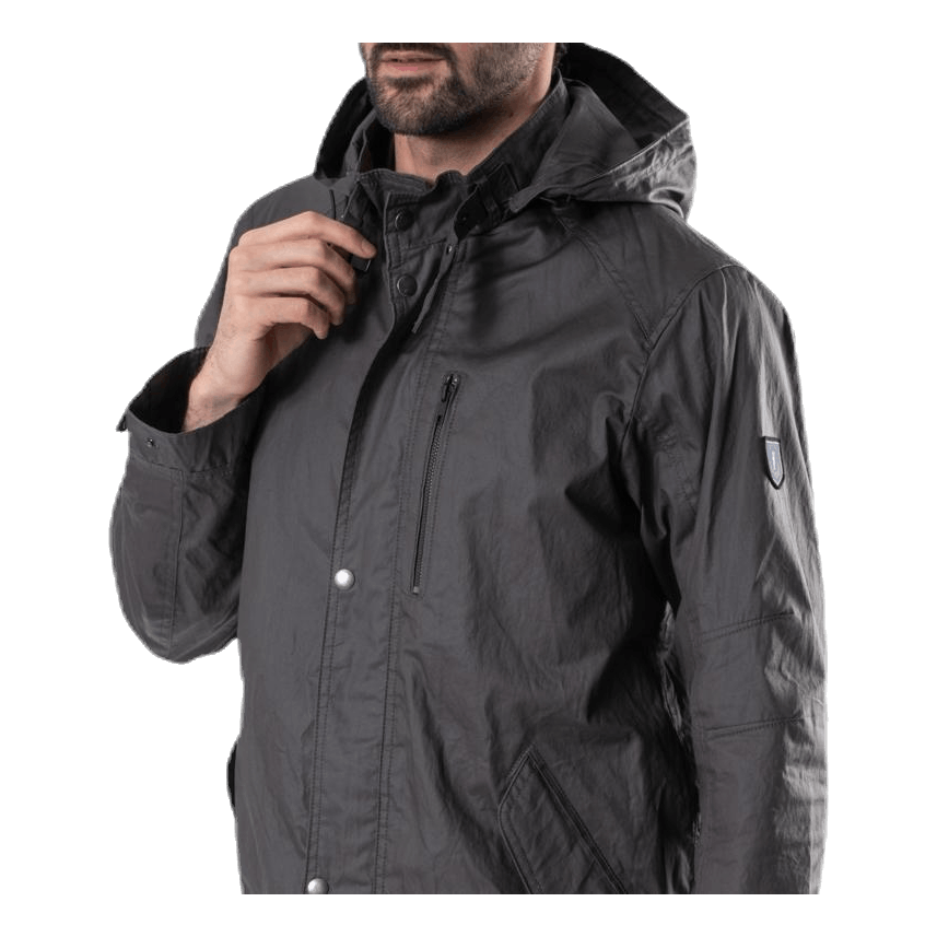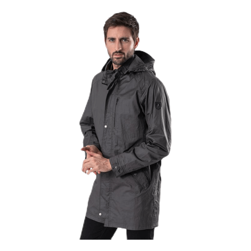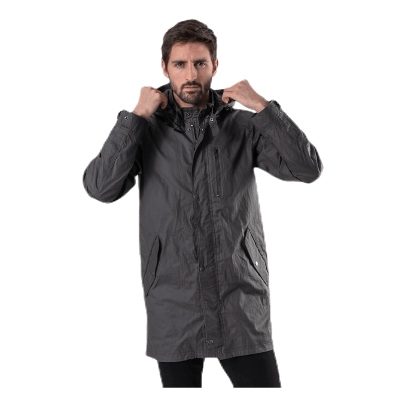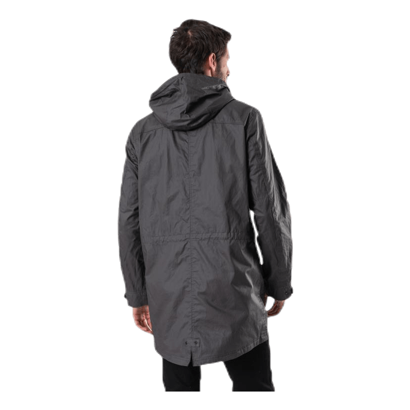 Parkas-mallinen takki hienolla takaosalla. Tämä malli on valmistettu vettähylkivästä, vahatusta canvas-kankaasta ja siinä on ohut nylon-vuori. Huppu on irrotettava. Kaksi hienoa taskua sivulla sekä vetoketjulla suljettava rintatasku. Kaksisuuntainen vetoketju etuhelmassa.